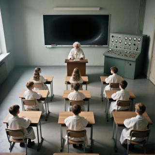 In der letzten Reihe sitzt links ein Junge alleine (Neptun), der hintere rechte Platz ist leer. Aufmerksam hören sie einem älteren Mann mit lockigem, weißem Haar (Lehrer), der auf einem Stuhl vor einem Schaltpult mit vielen Reglern und Knöpfen sitzt. Hinter dem Pult in der Wand ist großes rechteckiges schwarzes Loch.