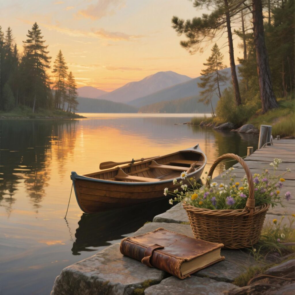 - Symbolik: Der See mit ruhigem Wasser, die Berge, das Boot und die Abendstimmung deuten auf eine starke Sehnsucht nach Ruhe, Harmonie und Naturverbundenheit hin. Das Buch und der Korb mit Blumen sprechen fĂŒr eine introvertierte, reflektierende Persönlichkeit, die in Literatur, Natur und Stille Sinn findet.