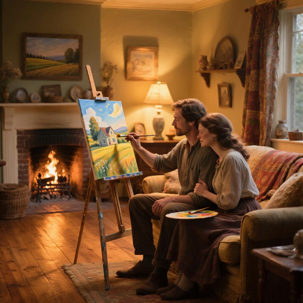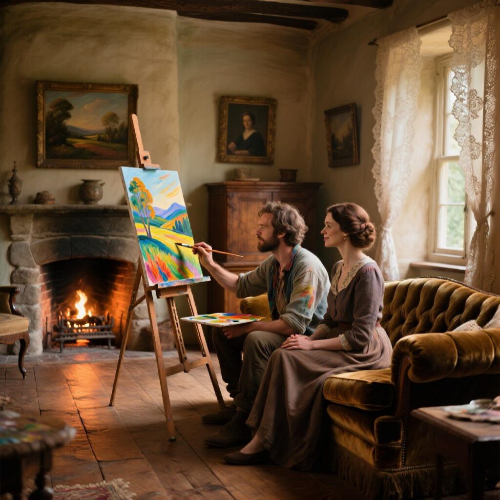 - Symbolik: Der KĂŒnstler zeigt sich selbst beim Malen, im Zentrum steht die kreative TĂ€tigkeit. Gleichzeitig ist er nicht allein â eine Frau sitzt ihm zugewandt, aufmerksam, in WĂ€rme und Geborgenheit (Kamin, Zuhause).