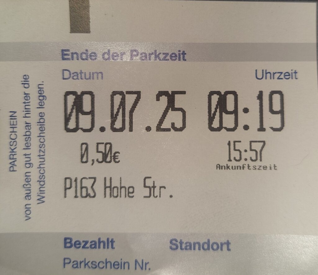 Am Nachmittag des 8. Juli 2025, um 15:57 Uhr, löstest du in der Hohe Straße in Dortmund ein Parkticket.